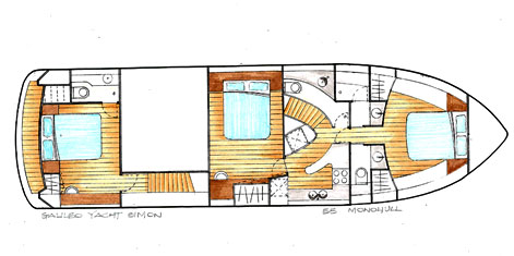 Profil | Profil Version flybridge | Vue extérieure | Pont superieur version flybridge | Pont principal 1 | Pont principal 2